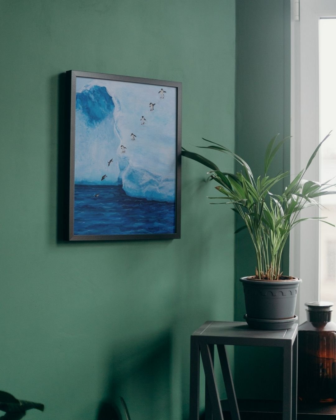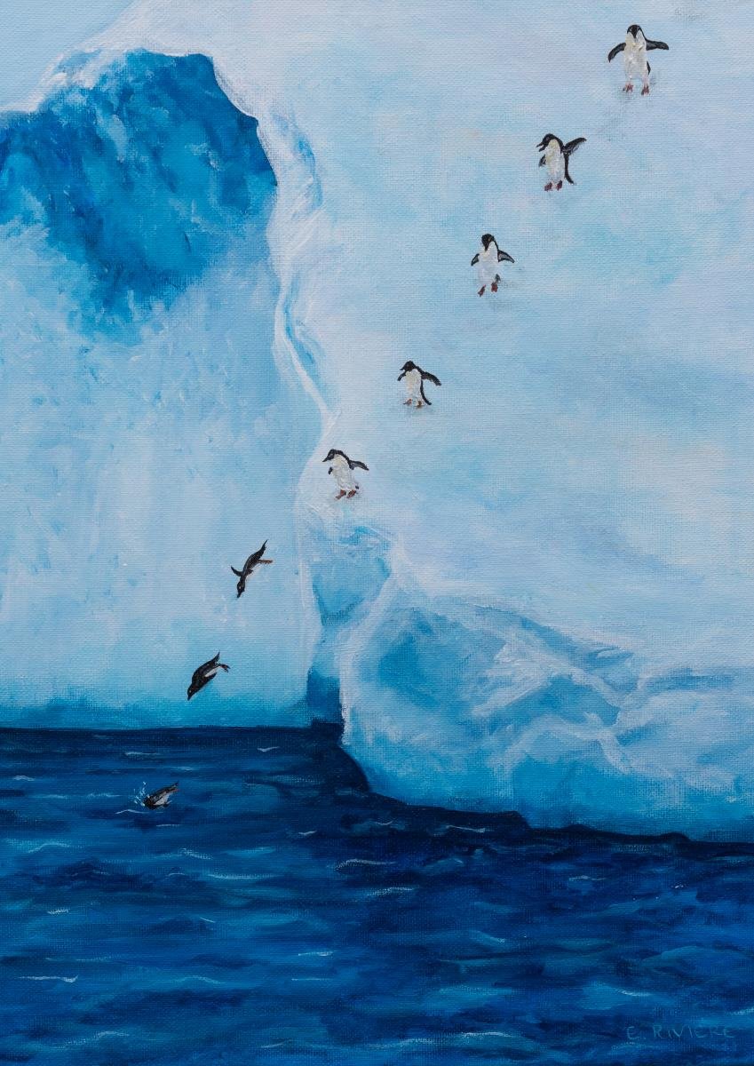 The Penguin Slalom captures the joy and liveliness of a group of penguins as they slide gracefully down the ice and dive into the water. This vibrant and dynamic painting is full of movement and charm, making it a perfect piece for anyone who loves nature or wildlife.
