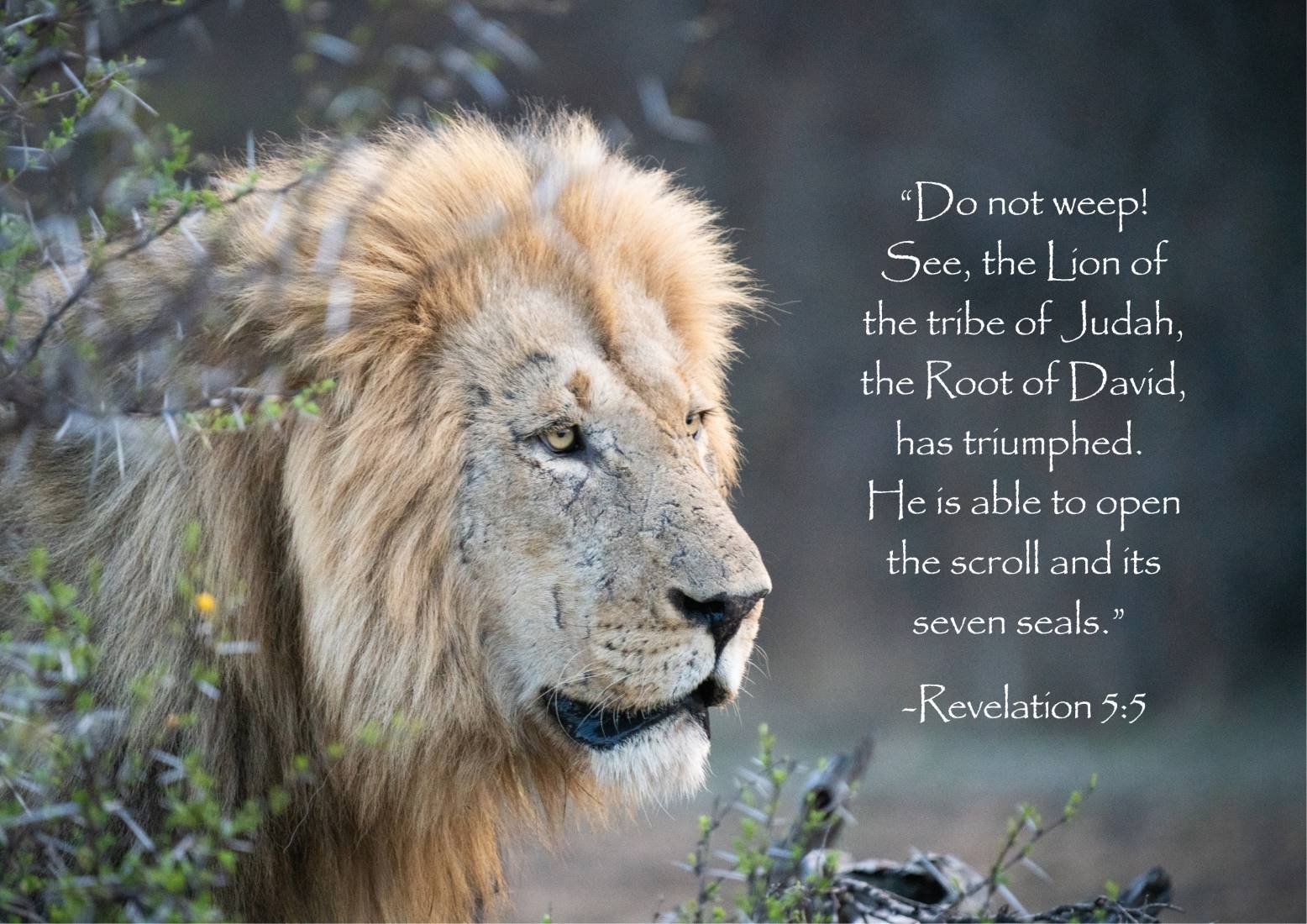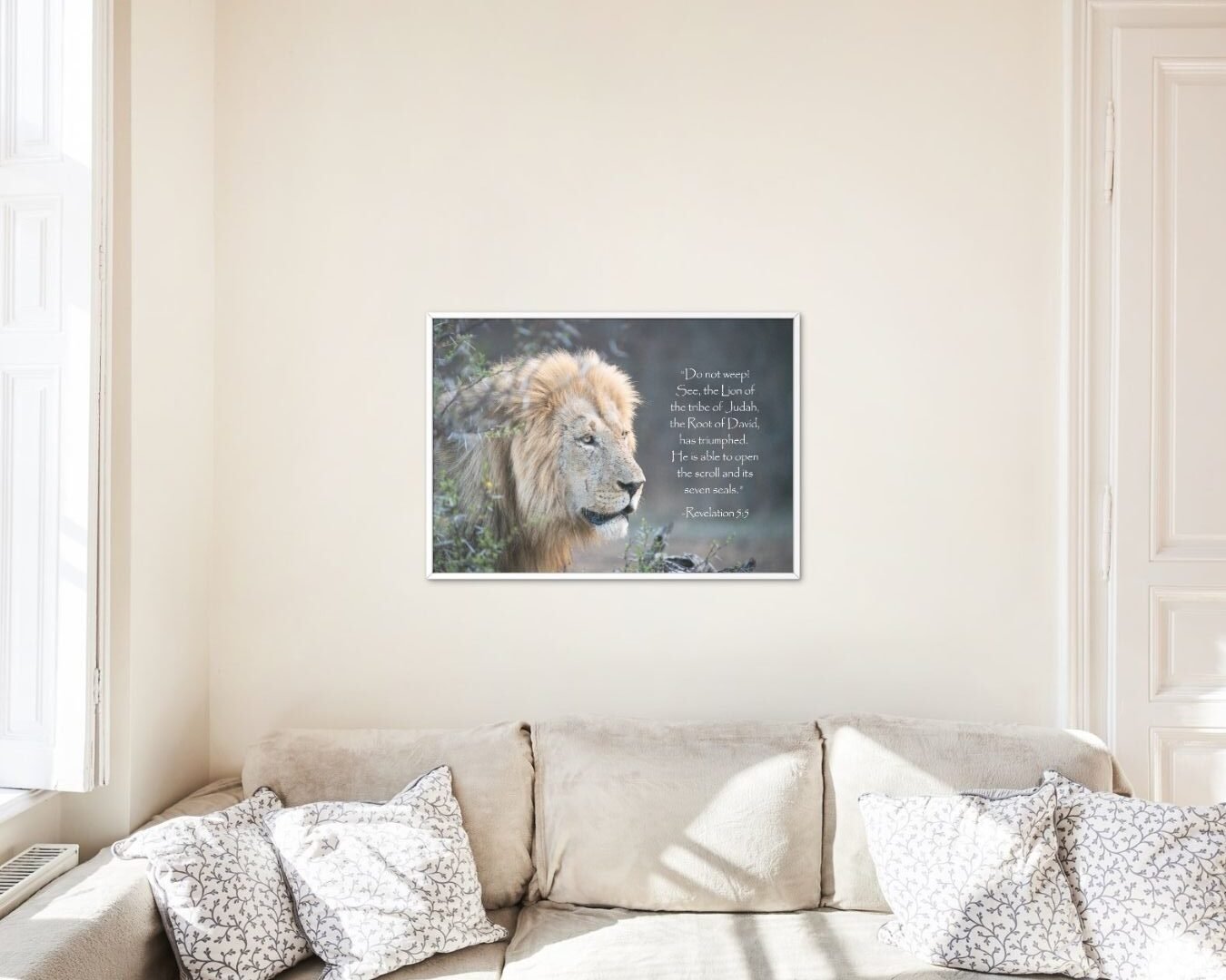 The Revelation 5:5 Lion Print captures the awe-inspiring majesty of the lion, photographed in the wild during my time to South Africa. Paired with the stirring words of Revelation 5:5, this piece is a visual and spiritual statement of strength and hope.